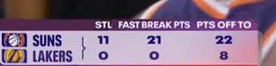本場(chǎng)比賽,湖人隊(duì)整體活力不足。在第三節(jié)結(jié)束時(shí)的一個(gè)數(shù)據(jù)統(tǒng)計(jì)中,湖人隊(duì)本場(chǎng)比賽還沒有完成過一次搶斷,同時(shí)快攻得分也為0;反觀太陽隊(duì)拿到了11次搶斷,并通過快攻得到了21分。此外,利用對(duì)手失誤得分方面,湖人隊(duì)依然以8-22落后。