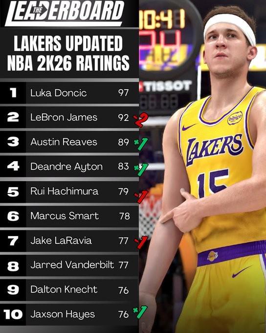 湖人隊(duì)其他球員中,東契奇保持97分仍為全隊(duì)最高,里夫斯和艾頓各加1分分別為89和83分。八村壘和拉拉維亞各降一分,杰克遜-海耶斯?jié)q了1分。