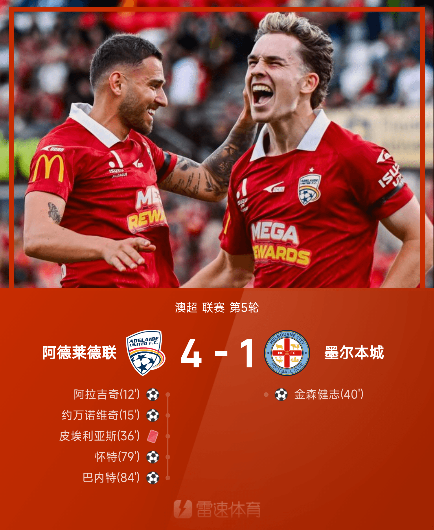 雷速體育11月21日訊 25/26賽季澳超聯(lián)賽第5輪,阿德萊德聯(lián)4-1戰(zhàn)勝墨爾本城。