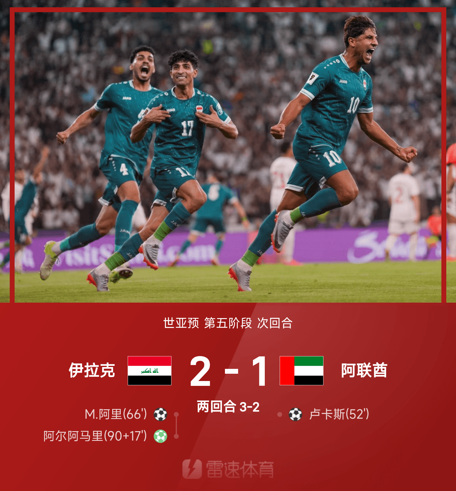 雷速體育11月19日訊 26賽季世亞預(yù)第五階段次回合,伊拉克2-1戰(zhàn)勝阿聯(lián)酋,以總比分3-2(首回合1-1)淘汰對手晉級。