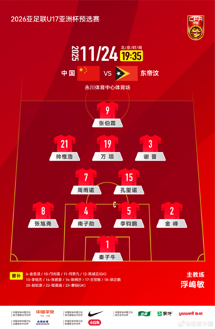 U17亞洲杯中國(guó)vs東帝汶首發(fā):鄺兆鐳替補(bǔ),帥惟浩先發(fā)