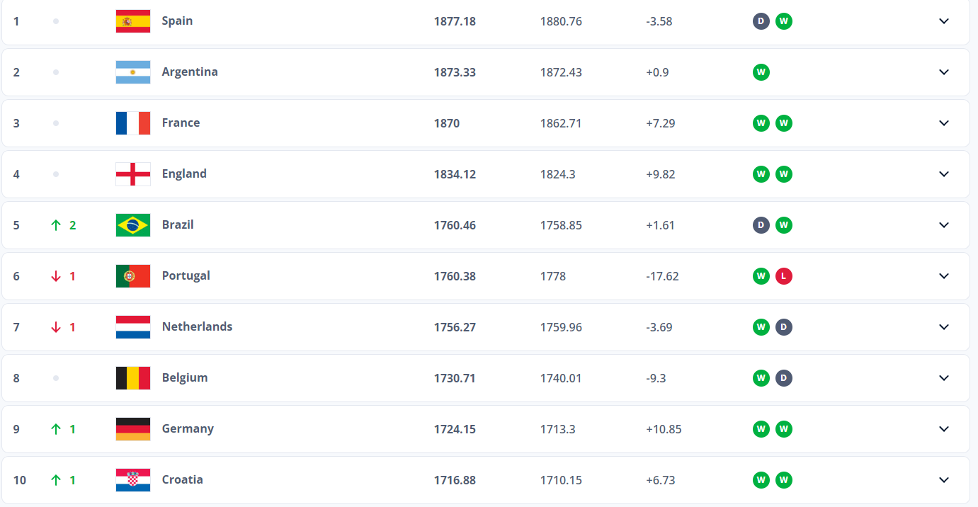 FIFA最新世界排名:西班牙繼續(xù)領(lǐng)跑,國(guó)足維持世界第93