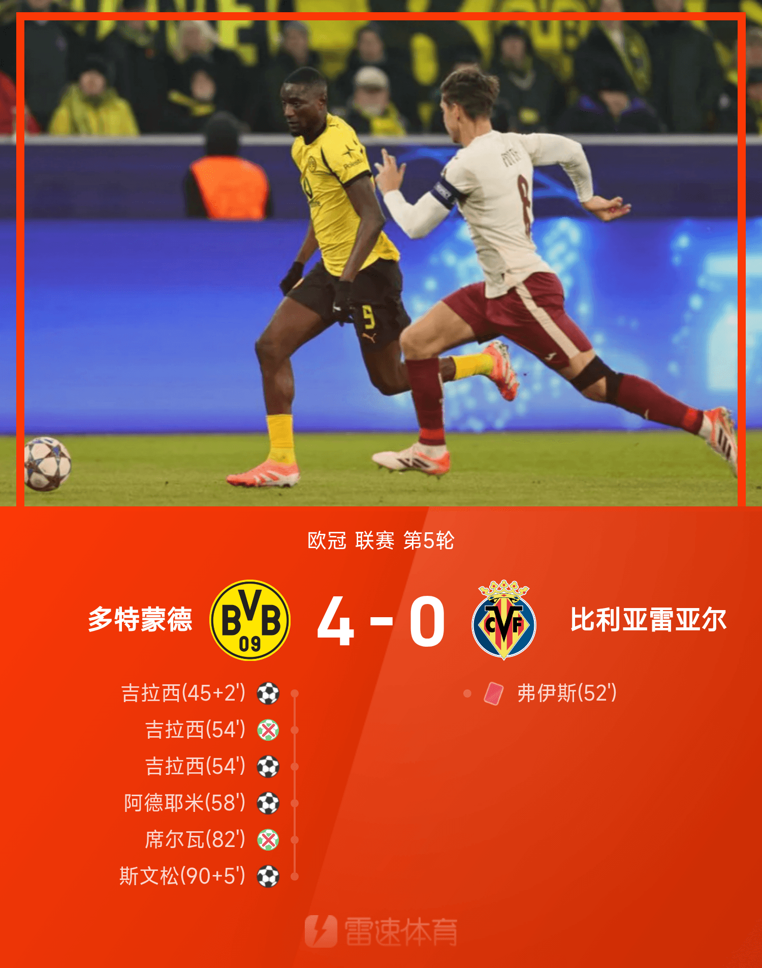歐冠戰(zhàn)報(bào):吉拉西雙響,多特蒙德4-0十人比利亞雷亞爾