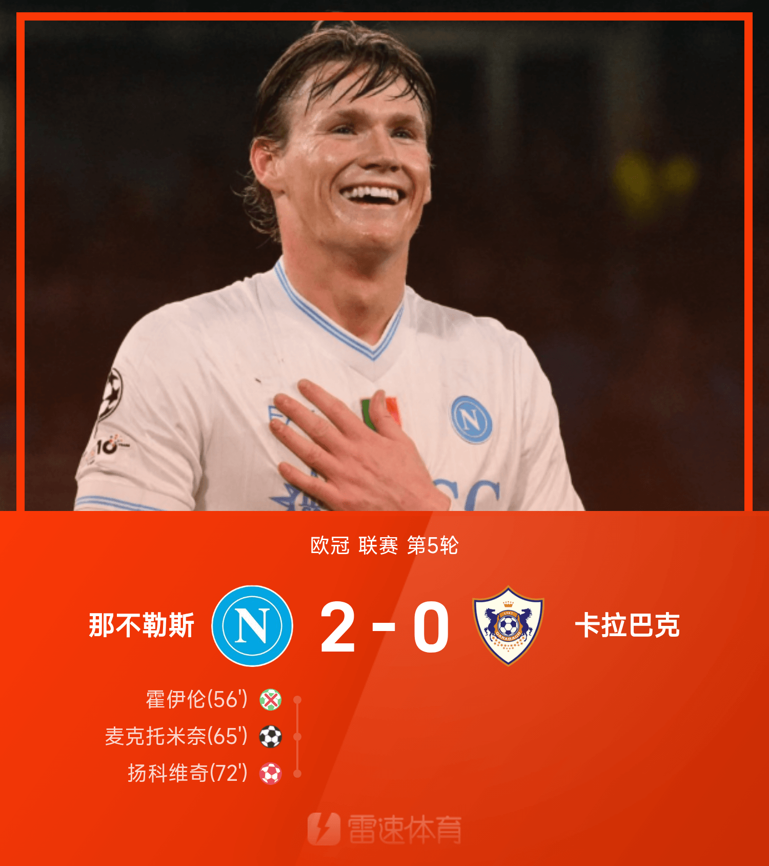 雷速體育11月26日訊 25/26賽季歐冠聯(lián)賽階段第5輪,那不勒斯在主場(chǎng)2-0擊敗了卡拉巴克。