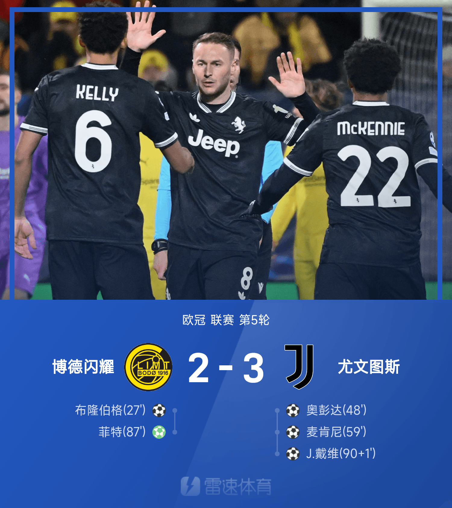 雷速體育11月26日訊 25/26賽季歐冠聯(lián)賽第5輪,尤文圖斯3-2戰(zhàn)勝博德閃耀。