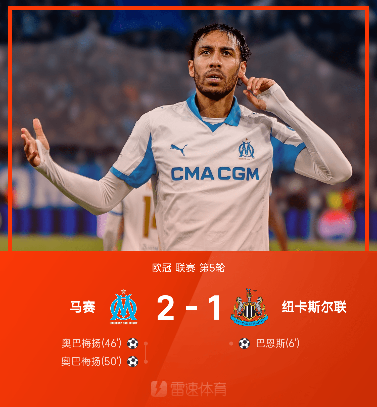 歐冠戰(zhàn)報(bào):奧巴梅揚(yáng)4分鐘內(nèi)雙響,馬賽2-1逆轉(zhuǎn)擊敗紐卡