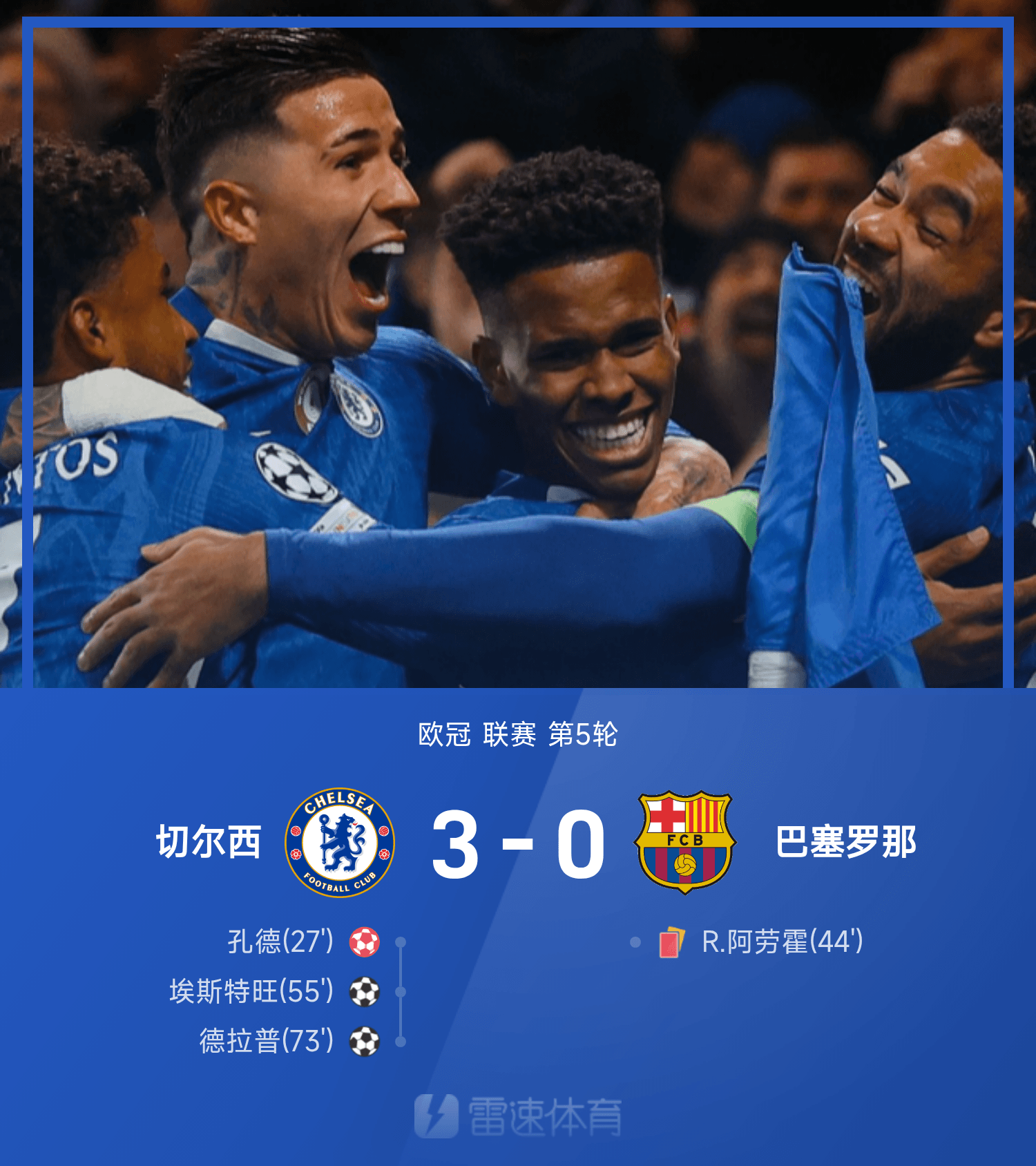 雷速體育11月26日訊 25/26賽季歐冠聯(lián)賽第5輪,切爾西主場(chǎng)以3-0大勝巴塞羅那。