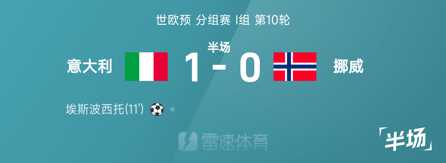 雷速體育11月17日訊 26賽季世歐預(yù)分組賽I組第10輪,意大利迎戰(zhàn)挪威。半場(chǎng)戰(zhàn)罷,雙方比分暫為意大利1-0挪威,埃斯波西托破門建功。