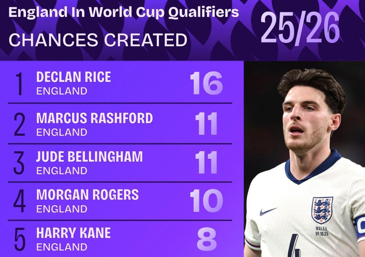 根據Squawka的統計,在本屆世預賽歐洲區(qū)的比賽中,賴斯一共為英格蘭隊創(chuàng)造了16次機會,這一數據排在隊內所有球員的第一位,比排名并列第二的拉什福德和貝林厄姆多出了5次。