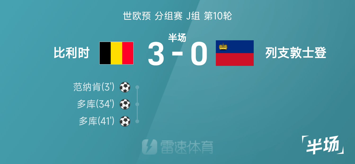 34’多庫禁區(qū)中路接應橫傳掃射破門,比利時2-0列支敦士登
