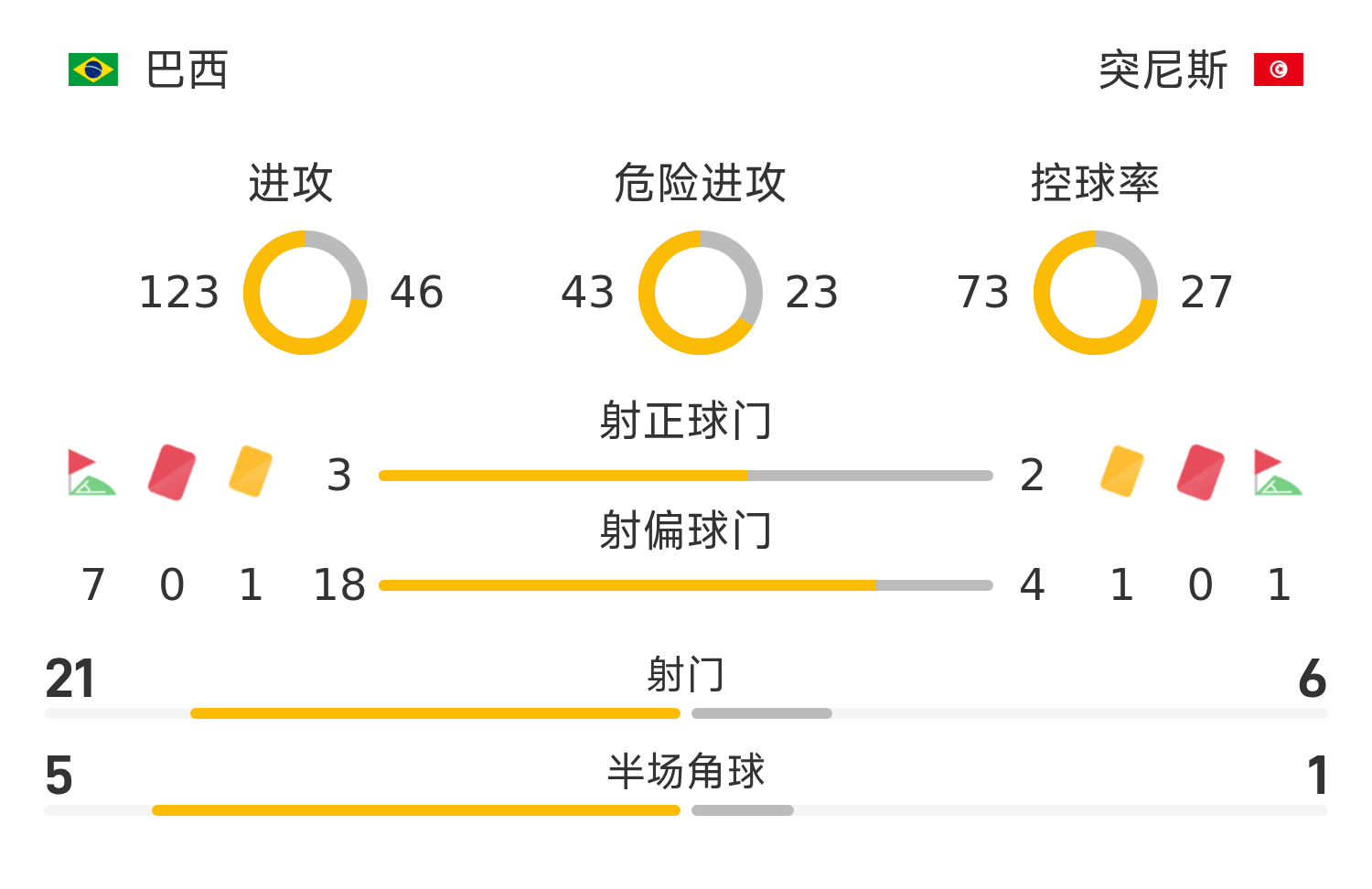 雷速體育11月19日訊 25賽季國際友誼十一月,巴西1-1戰(zhàn)平突尼斯。上半場馬斯圖里率先破門,半場結(jié)束前,布朗恩禁區(qū)手球送點(diǎn),埃斯特旺點(diǎn)射將比分扳平。下半場羅克突入禁區(qū)被薩西放倒,巴西再獲一粒點(diǎn)球,但帕奎塔主罰將球踢飛。最終,巴西1-1戰(zhàn)平突尼斯。