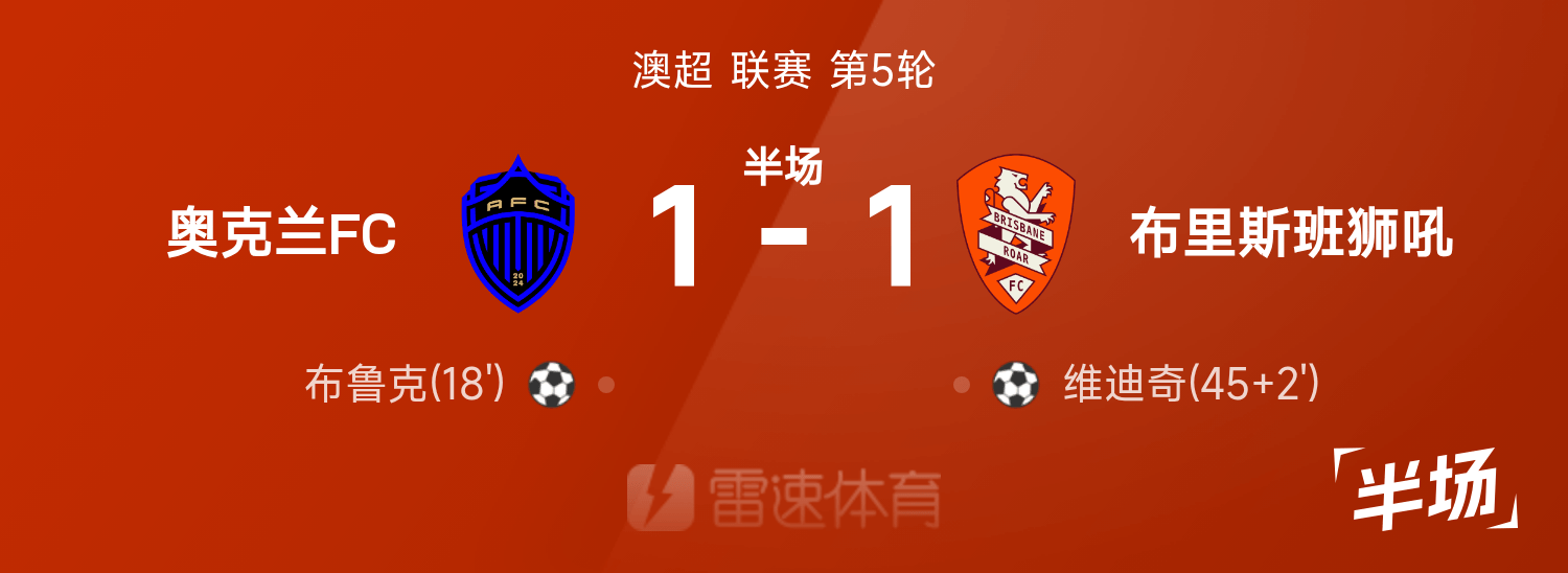 雷速體育11月23日訊 25/26賽季澳超聯(lián)賽第5輪,奧克蘭FC迎戰(zhàn)布里斯班獅吼。半場(chǎng)戰(zhàn)罷,雙方比分暫為奧克蘭FC1-1布里斯班獅吼,布魯克、維迪奇破門建功。