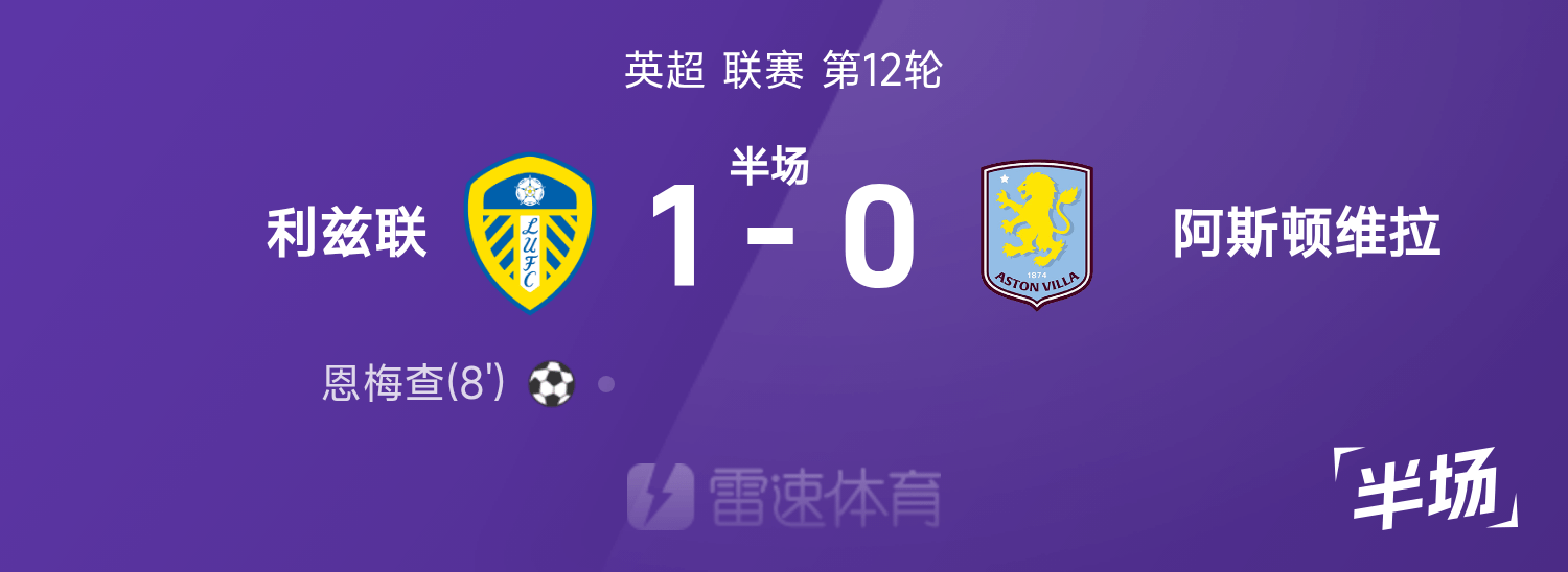雷速體育11月23日訊 25/26賽季英超聯(lián)賽第12輪,利茲聯(lián)迎戰(zhàn)阿斯頓維拉。恩梅查破門經(jīng)VAR認(rèn)定有效,布恩迪亞任意球制造威脅,沃特金斯遠(yuǎn)射造險(xiǎn)。半場戰(zhàn)罷,雙方比分暫為利茲聯(lián)1-0阿斯頓維拉。