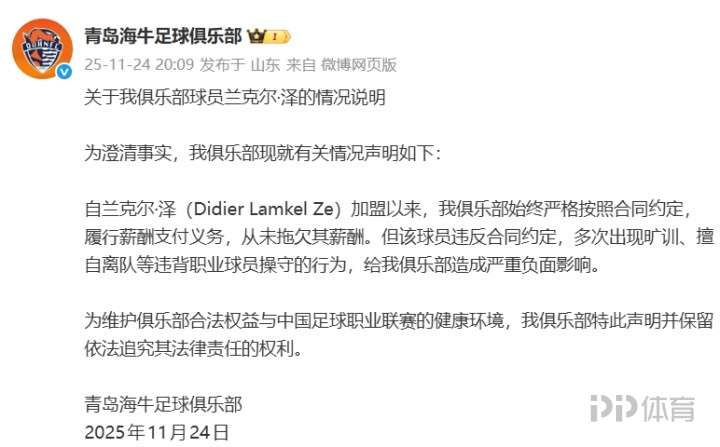 針對球員蘭克爾·澤指控拖欠工資,以及其他一系列風(fēng)波,青島海牛發(fā)布了官方說明。