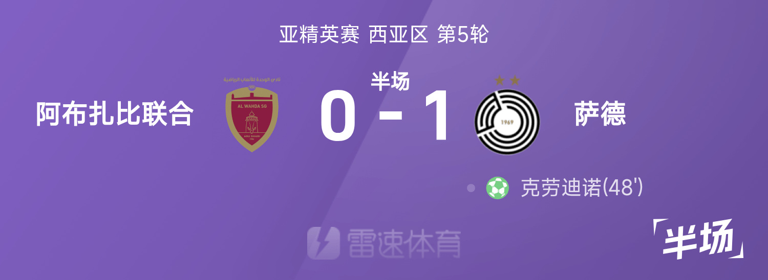 雷速體育11月26日訊 25/26賽季亞精英賽西亞區(qū)第5輪,阿布扎比聯(lián)合迎戰(zhàn)薩德。半場戰(zhàn)罷,雙方比分暫為阿布扎比聯(lián)合0-1薩德,克勞迪諾破門建功。