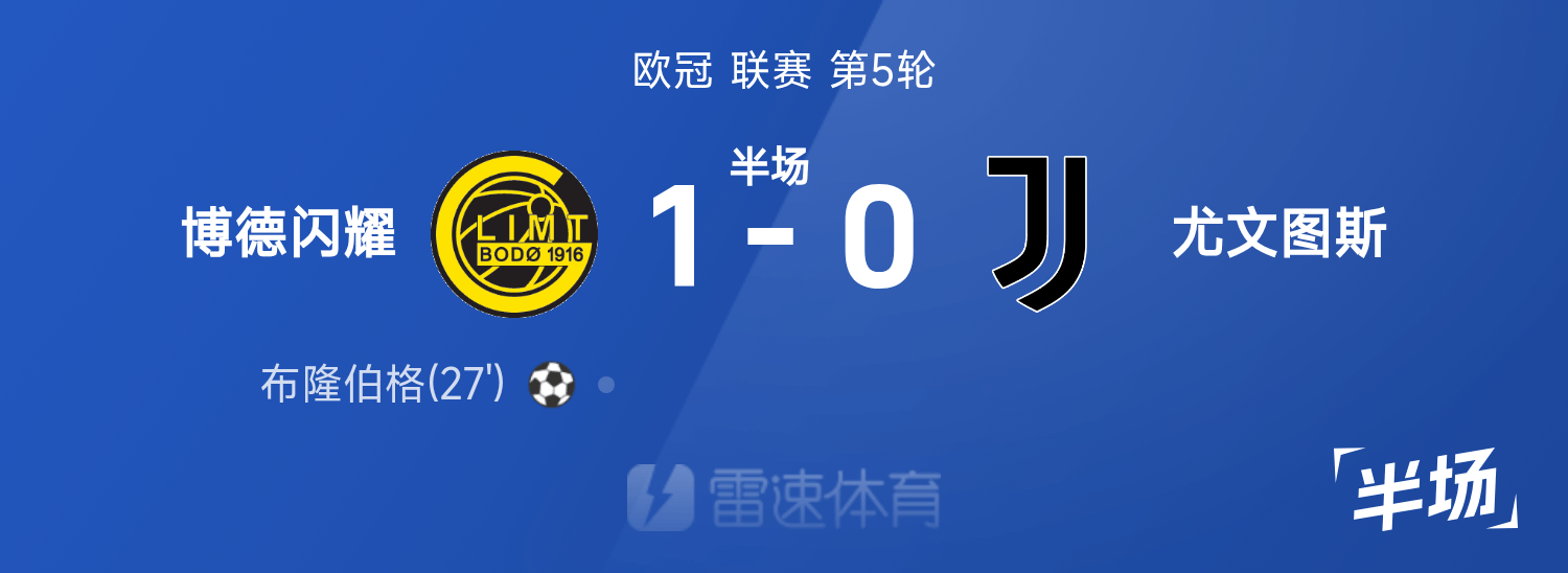 雷速體育11月26日訊 25/26賽季歐冠聯(lián)賽第5輪,博德閃耀迎戰(zhàn)尤文圖斯。半場(chǎng)戰(zhàn)罷,雙方比分暫為博德閃耀1-0尤文圖斯,布隆伯格破門建功。