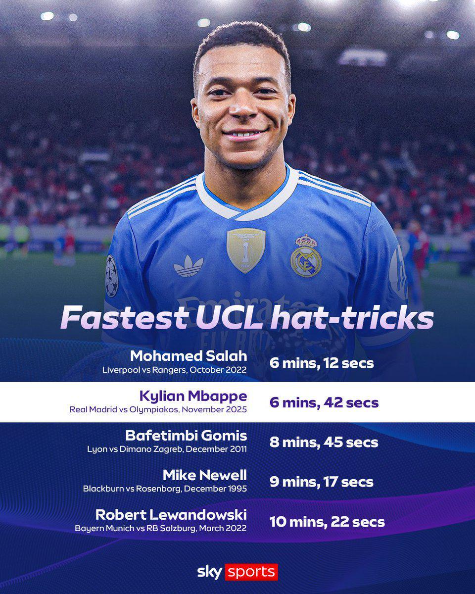 在周四凌晨歐冠聯(lián)賽階段第5輪比賽中,皇馬客場4-3擊敗奧林匹亞科斯,其中姆巴佩打進(jìn)4球,完成大四喜,并在6分42秒內(nèi)打進(jìn)了本場比賽個人的第三個進(jìn)球。