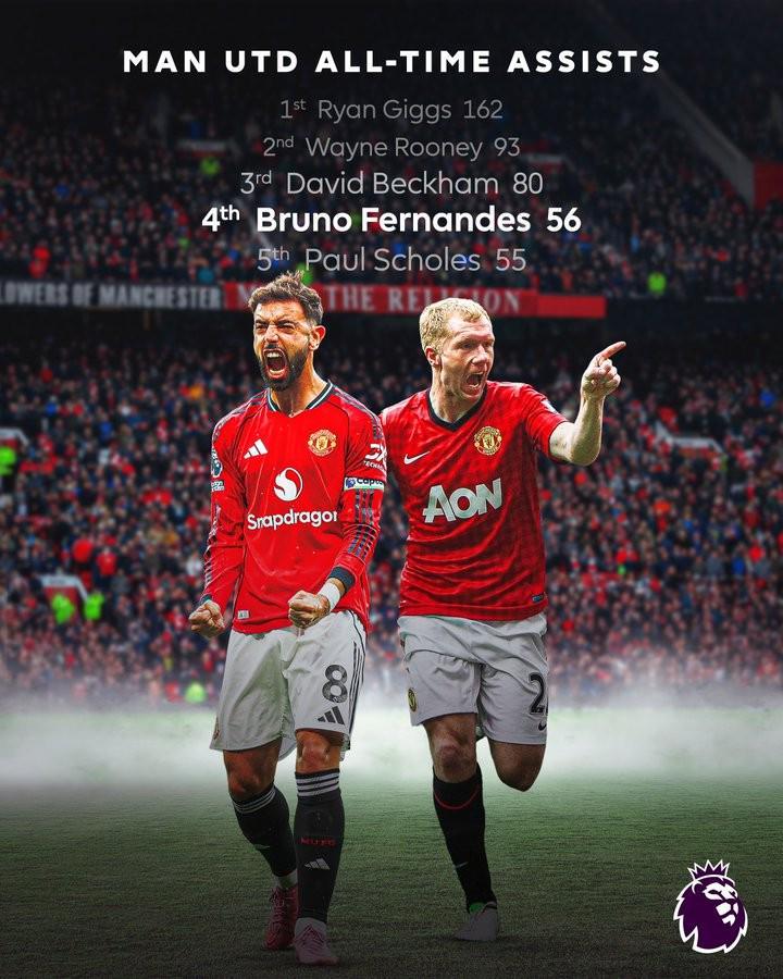 布魯諾-費(fèi)爾南德斯代表曼聯(lián)在英超助攻56次,反超斯科爾斯,升至曼聯(lián)隊(duì)史英超助攻榜單第4名。