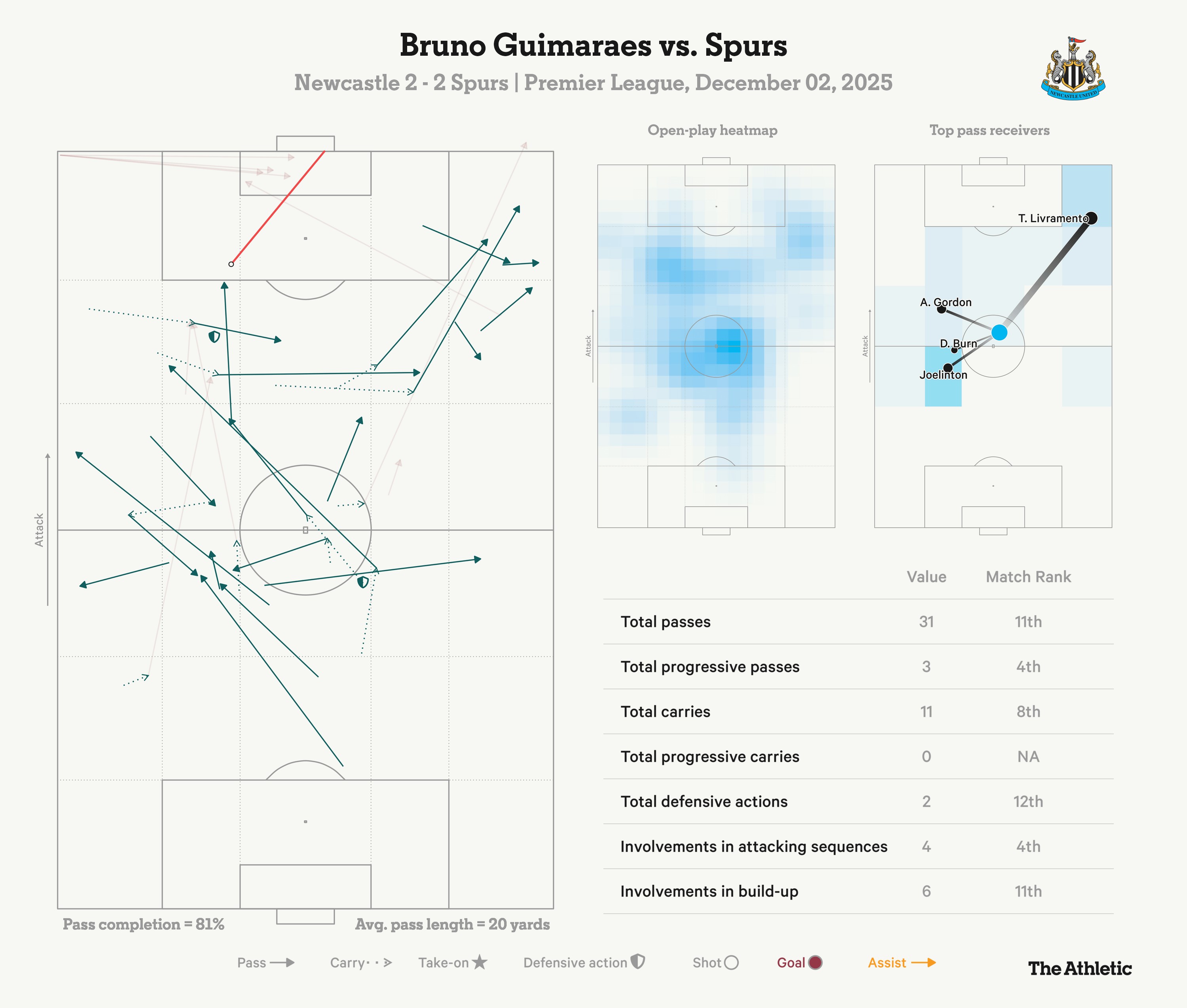 在紐卡斯?fàn)栭_(kāi)局相對(duì)活躍之后,比賽變得混亂,上半場(chǎng)沉悶乏味。中場(chǎng)休息時(shí),托納利被換下(這是一個(gè)令人擔(dān)憂的信號(hào)),吉馬良斯替補(bǔ)登場(chǎng),他的首次觸球是一腳將球傳出了邊線。