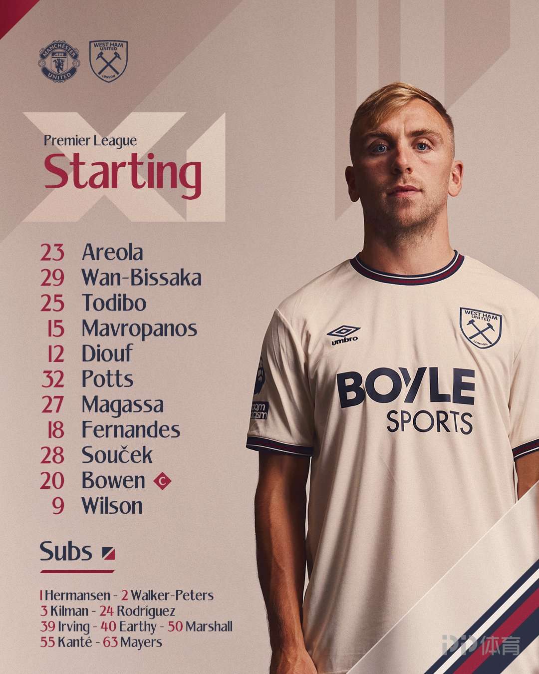 西漢姆聯(lián)首發(fā):23-阿雷奧拉、12-迪烏夫、25-托迪博、29-萬-比薩卡、15-馬夫羅帕諾斯、18-費爾南德斯、27-馬加薩、32-波茨、28-紹切克、20-鮑恩、9-威爾遜