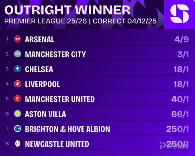 相關(guān)機(jī)構(gòu)列出了本賽季英超最新的奪冠賠率,阿森納居首,曼城、切爾西、利物浦前四。