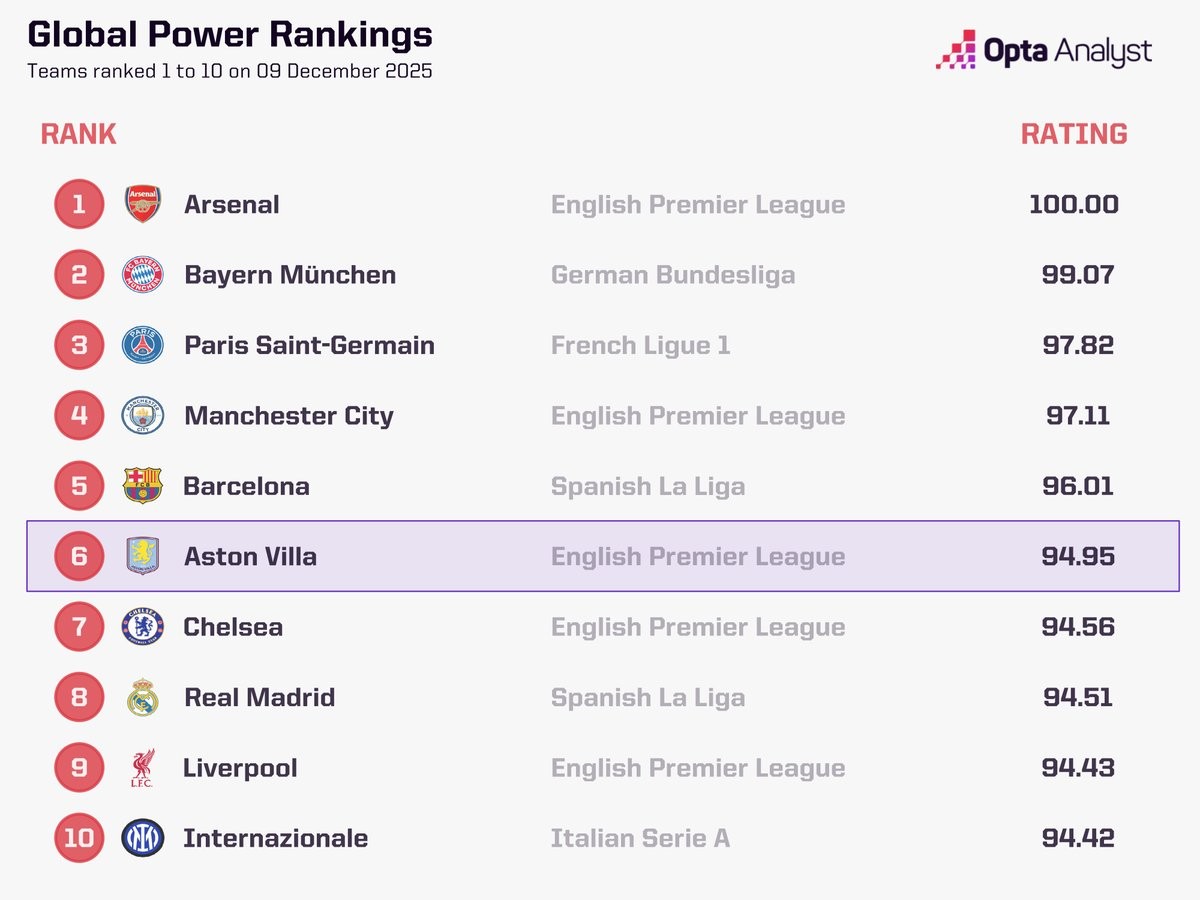 北京時間12月9日,知名數(shù)據(jù)機構Opta列出了全球范圍內(nèi)目前實力排名前10的俱樂部,阿森納、拜仁慕尼黑以及巴黎圣日耳曼位列前三,上周末絕殺槍手的阿斯頓維拉位居第6。