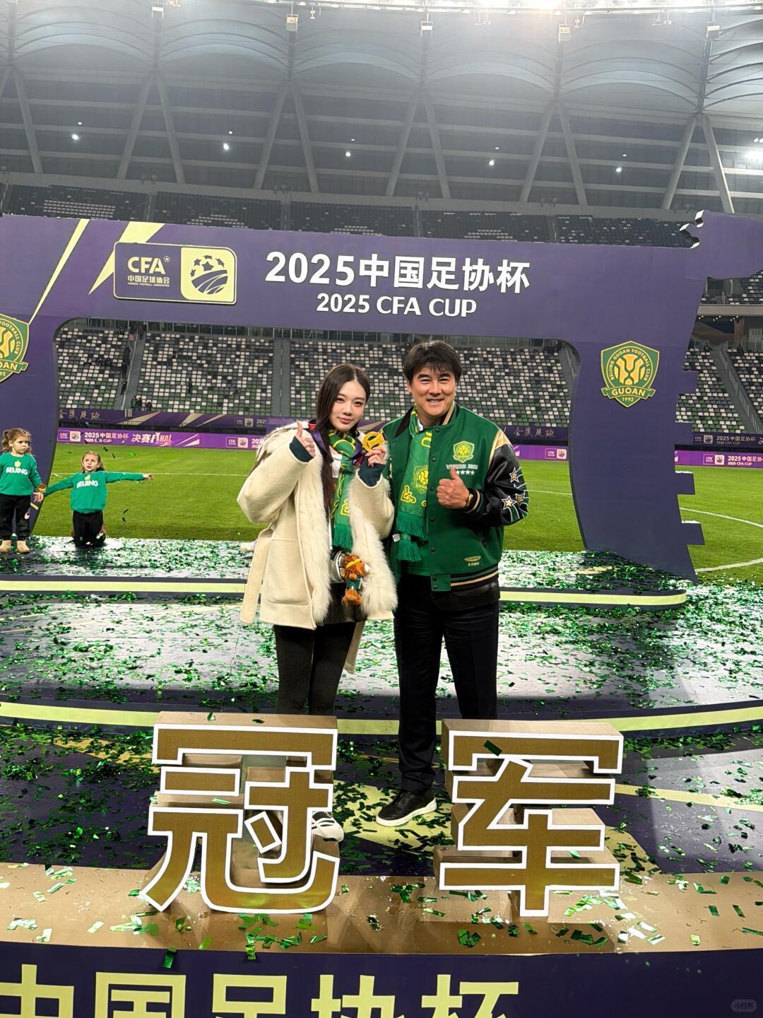 在北京國(guó)安最終贏得比賽后,李衍慧來(lái)到場(chǎng)地里,與父親李明、球員張稀哲合影,慶祝北京國(guó)安的奪冠。