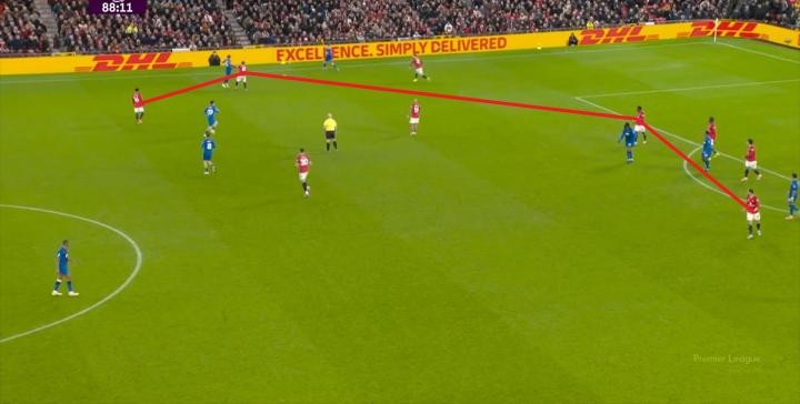 包括在這場比賽0-0的時(shí)候,曼聯(lián)清晰地展現(xiàn)了自己用三后衛(wèi)打四后衛(wèi)的優(yōu)勢,也就是翼衛(wèi)可以徹底將寬度拉開,于是在伯恩茅斯人盯人的防守體系的幫助下,曼聯(lián)的進(jìn)攻非常流暢,特征就是左右橫移起來非常輕松和簡單: