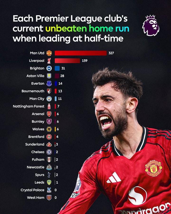 曼聯(lián)上一次在聯(lián)賽主場半場領先的情況下輸球得追溯到1984年5月,當時他們1-2遭伊普斯維奇逆轉,自那以來,曼聯(lián)在聯(lián)賽主場半場領先的情況下已經連續(xù)393場保持不敗,戰(zhàn)績?yōu)?59勝34平。