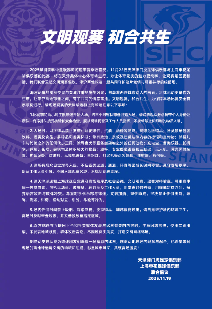 雷速體育11月19日訊 本賽季中超最后一輪開始前,將在最后一輪直接交鋒的對手天津津門虎和上海申花發(fā)布了聯(lián)合倡議書。
