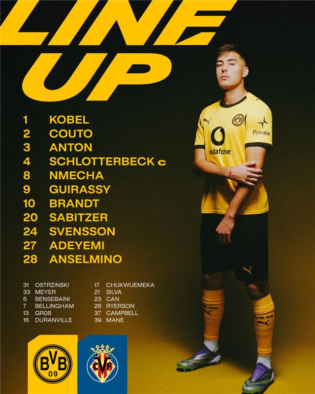 北京時間11月26日凌晨4:00,25/26賽季歐冠聯(lián)賽第5輪,多特蒙德主場迎戰(zhàn)比利亞雷亞爾,賽前首發(fā)公布。