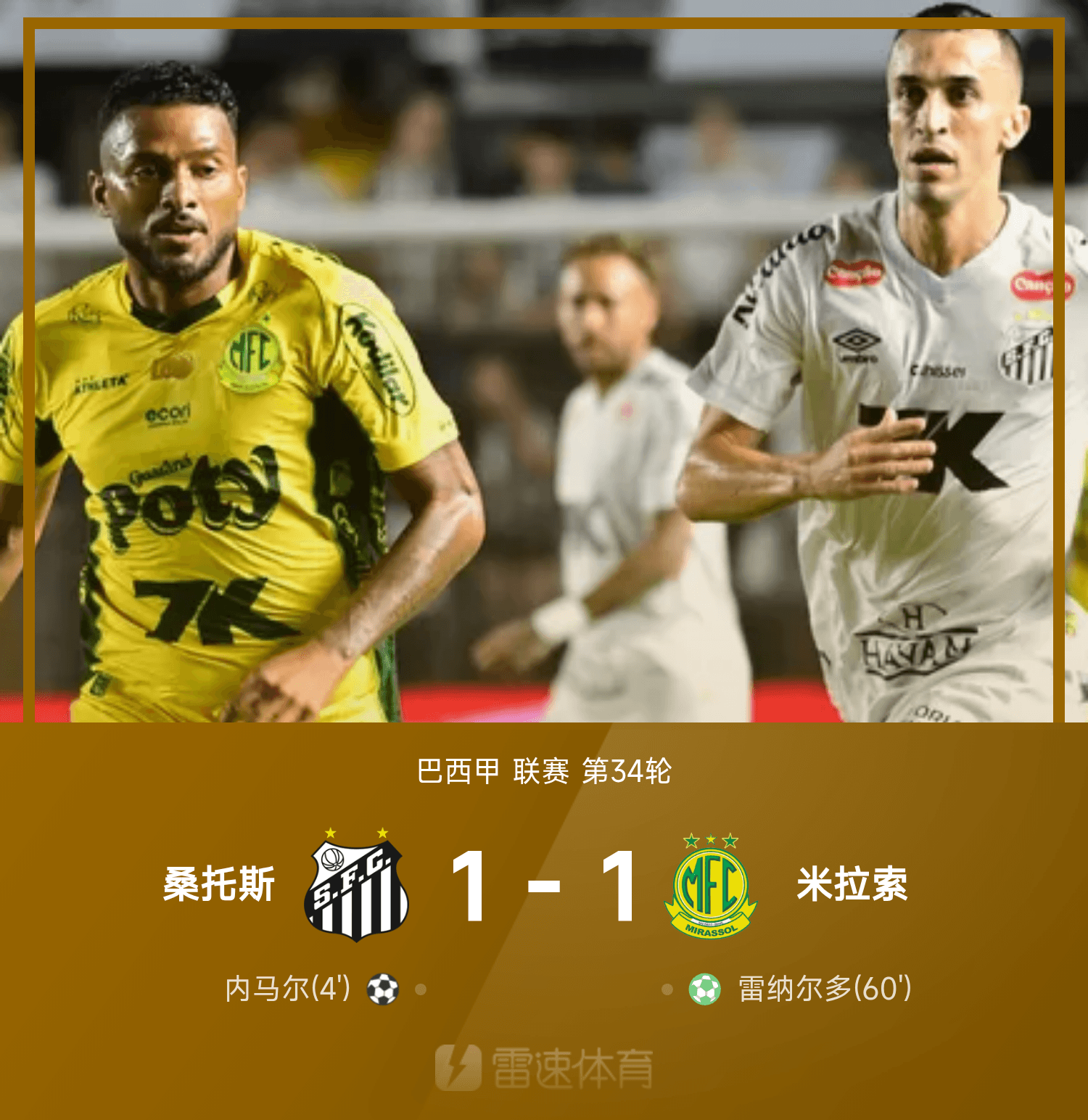 雷速體育11月20日訊 25賽季巴西甲聯(lián)賽第34輪,桑托斯1-1戰(zhàn)平米拉索。