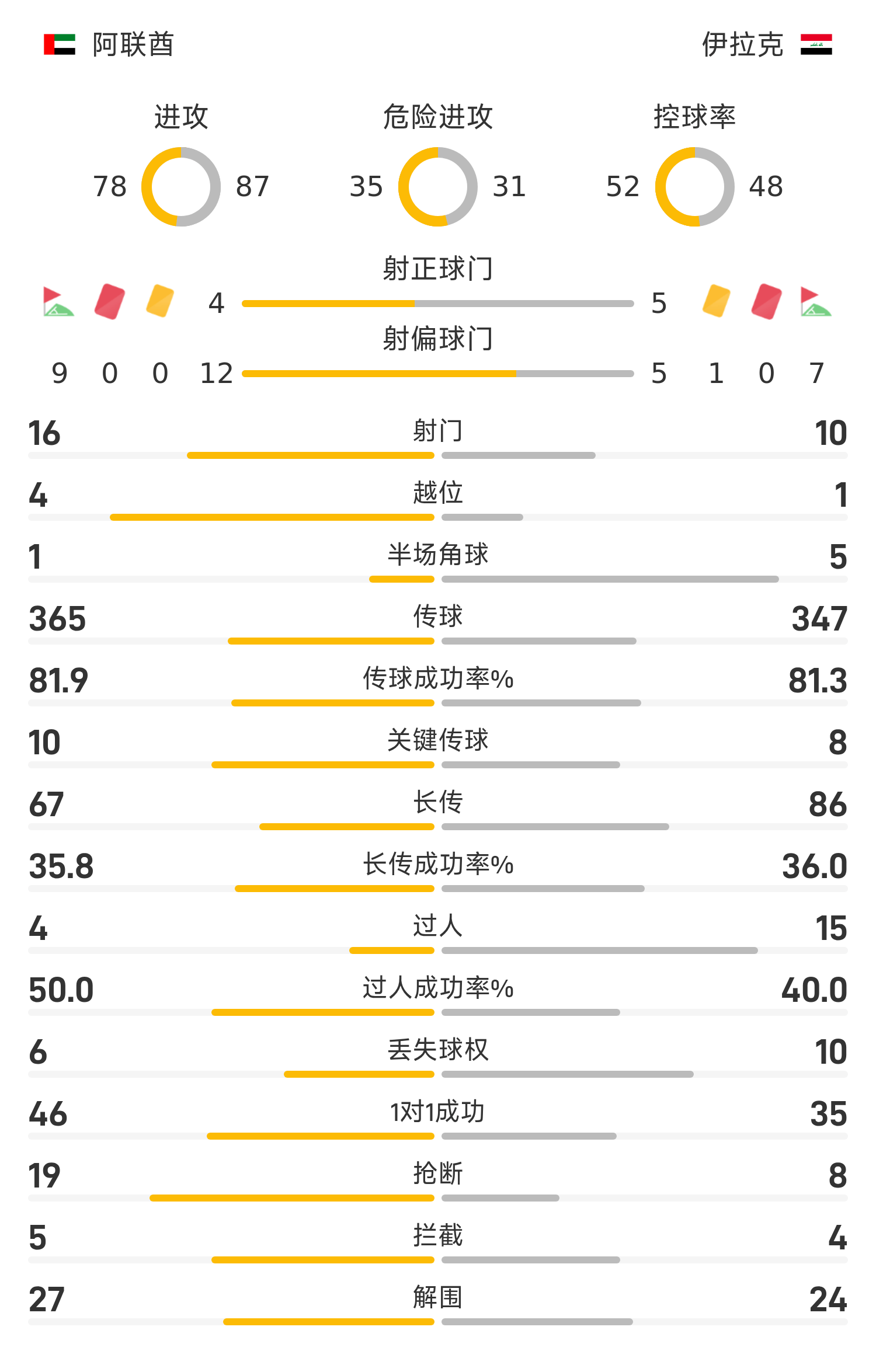 雷速體育11月14日訊 26賽季世亞預(yù)第五階段首回合,阿聯(lián)酋對陣伊拉克。開場第10分鐘,祖拜迪門前掃射破門。第18分鐘,拉馬丹助攻盧安沖頂破門,幫助阿聯(lián)酋1-1扳平比分。隨后兩隊互有攻守,阿聯(lián)酋門將伊薩屢次貢獻神撲,場上比分一直未被改寫。全場比賽傷停補時第6分鐘,吉梅內(nèi)斯主罰任意球幫助盧卡斯頭球破門,但因越位在先被判無效。最終阿聯(lián)酋以1-1戰(zhàn)平伊拉克。