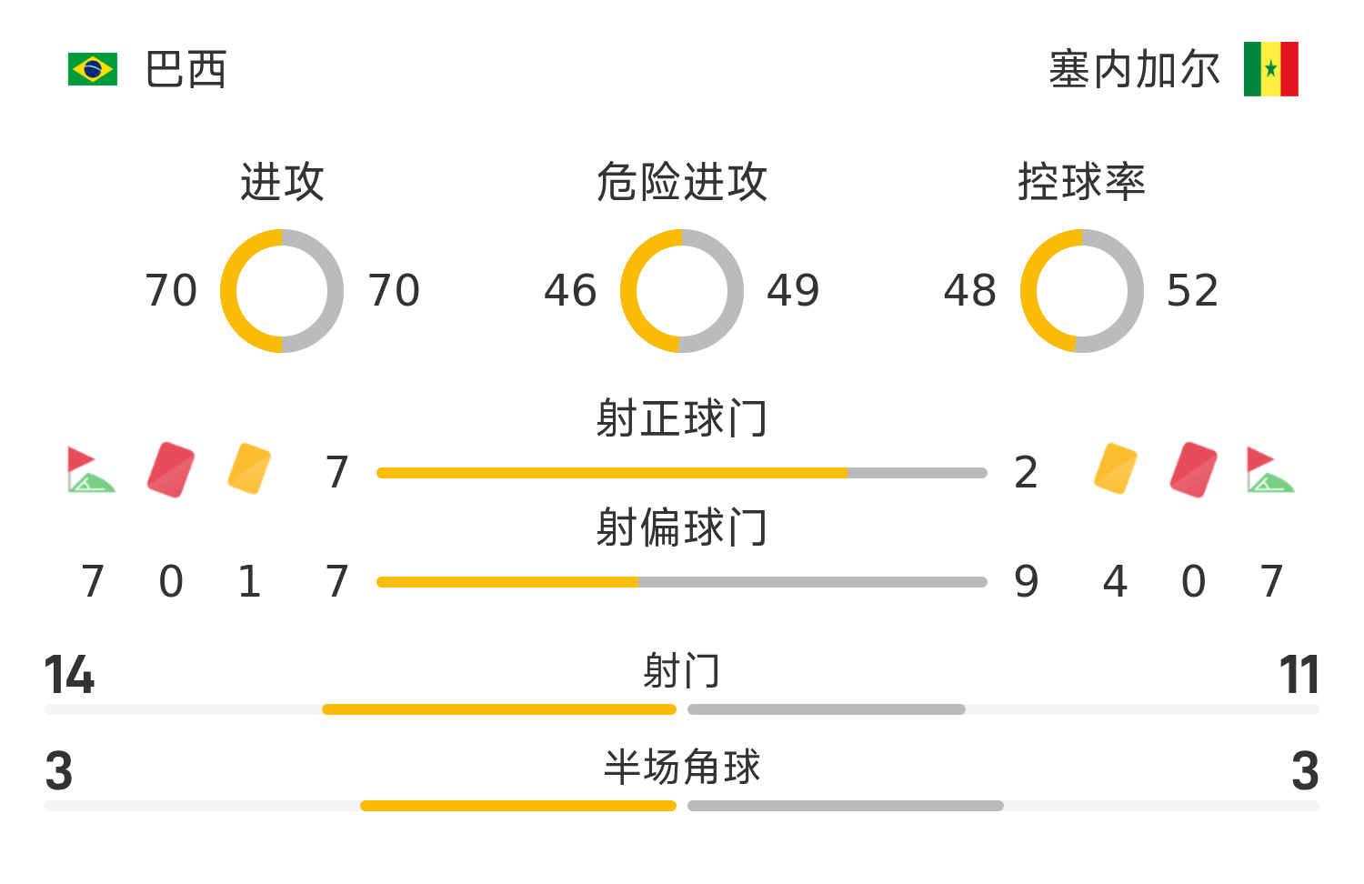 巴西首發(fā)陣容:23-埃德森、6-桑德羅(90’15-布魯諾)、4-馬爾基尼奧斯、2-米利唐、3-加布里埃爾(64’14-韋斯利)、5-卡塞米羅、8-吉馬良斯、7-維尼修斯(90’16-恩里克)、21-庫尼亞(65’22-佩德羅)、10-羅德里戈(83’11-帕奎塔)、20-埃斯特旺(83’19-恩里克)