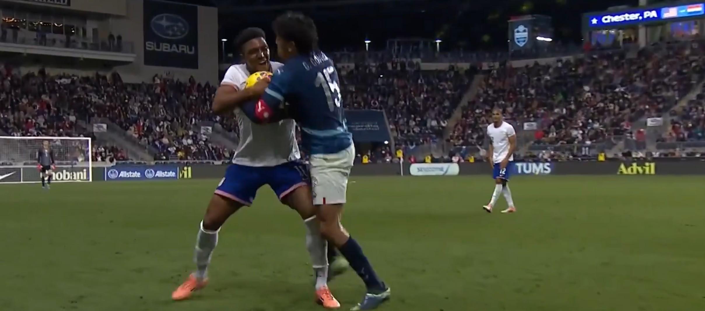 本場比賽第90+4分鐘,在一次界外球發(fā)球前。巴拉圭球員認(rèn)為解圍踢到了美國球員腿上出界,球權(quán)該歸屬自己。而美國隊(duì)球員亞歷克斯-弗里曼則認(rèn)為此球?yàn)榘屠珀?duì)解圍出界,因此保住皮球不放。巴拉圭隊(duì)長古斯塔沃-戈麥斯隨即與弗里曼開始拉扯爭球,雙方僵持不下,隨后兩隊(duì)隊(duì)員一擁而上引發(fā)大規(guī)模沖突。