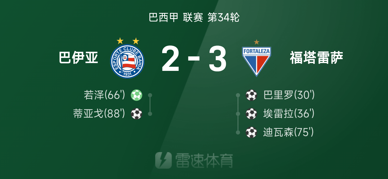 雷速體育11月21日訊 25賽季巴西甲聯(lián)賽第34輪,福塔雷薩3-2戰(zhàn)勝巴伊亞。全場(chǎng)比賽,埃雷拉發(fā)揮出色貢獻(xiàn)1射1傳,巴里羅、迪瓦森破門建功,若澤、蒂亞戈破門難救主。
