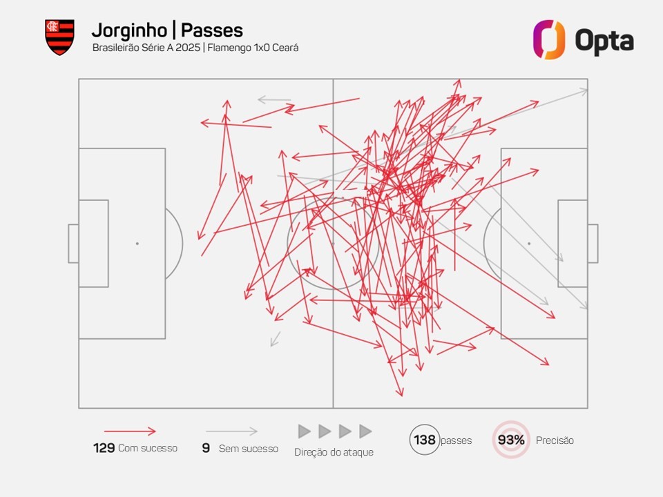 據(jù)統(tǒng)計,本場比賽若日尼奧完成了129次傳球,這是2025年巴西足球甲級聯(lián)賽單場傳球次數(shù)第二高紀錄。而最高紀錄也是由他自己保持的,當時對陣維多利亞時若日尼奧完成了132次傳球。