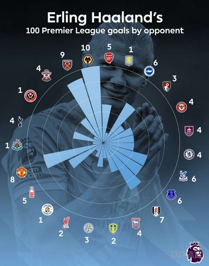 哈蘭德達成英超百球里程碑,英超官方也曬出哈蘭德百球攻破球門對手分布。