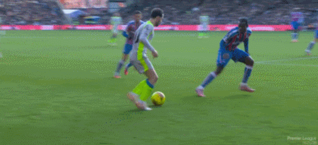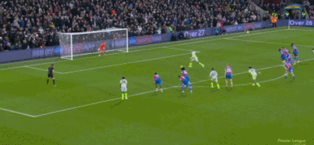 第41分鐘,B席右路回做,努內(nèi)斯斜傳送到禁區(qū)后點(diǎn),哈蘭德拍馬趕到頭球攻門得手,曼城暫1-0水晶宮。