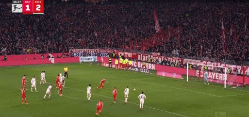 第45+2分鐘,伯溫開出任意球,波圖爾斯基頭球破門,美因茨1-1拜仁
