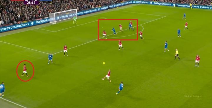 包括在這場比賽0-0的時(shí)候,曼聯(lián)清晰地展現(xiàn)了自己用三后衛(wèi)打四后衛(wèi)的優(yōu)勢,也就是翼衛(wèi)可以徹底將寬度拉開,于是在伯恩茅斯人盯人的防守體系的幫助下,曼聯(lián)的進(jìn)攻非常流暢,特征就是左右橫移起來非常輕松和簡單: